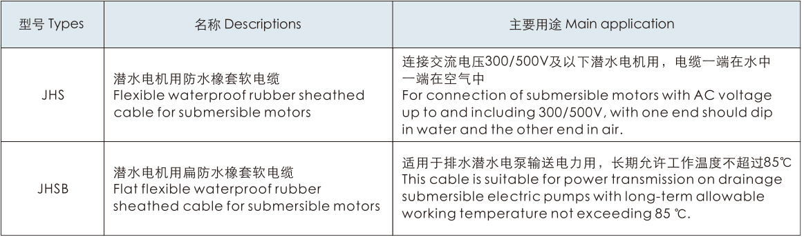 適用范圍本產(chǎn)品適用于交流額定電壓300/500V及以下潛水電機設(shè)備用防水橡套軟電纜。本產(chǎn)品執(zhí)行標(biāo)準(zhǔn)為:Q/321084KLA102。使用特性1、額定電壓Uo/U為300/500V及以下;2、電纜導(dǎo)體長期允許工作溫度為  a)JH型為65℃  b)JHSB型為85℃